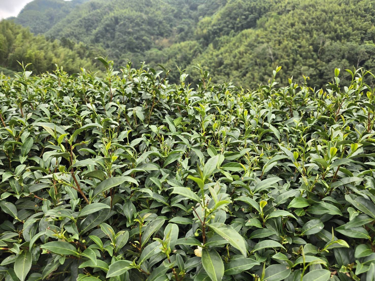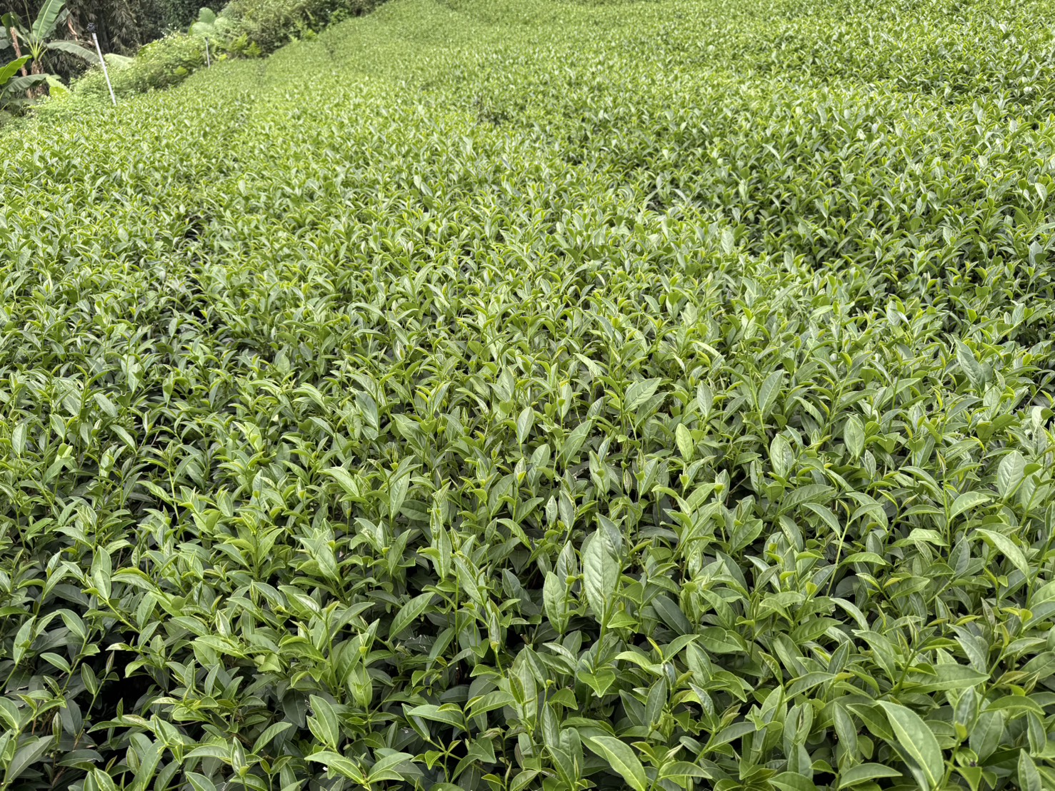 In our photo, the tea plants are dense and full of energy. The soil looks rich, and the leaves shimmer with health.